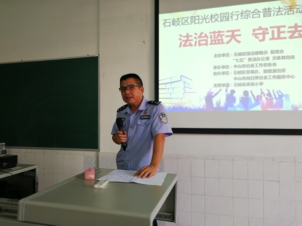 为进一步加强禁毒教育工作,提高广大师生对毒品危害性的认识,促进学生健康安全成长,9月11日下午,石岐高家基小学开展了“法治蓝天、守正去邪”阳光校园综合普法活动。此次活动由石岐区综治维稳办、文体教育局等单位联合主办,由中山市社会工作者协会承办,特邀烟墩派出所陈远华副所长担任主讲嘉宾。