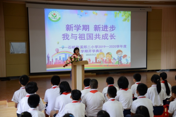 伴随着雄壮的国歌声,全体师生面向国旗肃立,开学仪式拉开了序幕。庄严的升旗仪式过后,戴织校长给开学典礼致辞。首先,戴织校长致辞欢迎一年级的241名小朋友、37名转校同学及12名新教师加入石岐张溪郑二小学的大家庭。接着,在中华人民共和国成立70周年即将到来之际,戴织校长结合中央电视台播出的开学第一课“五星红旗,我为你自豪”对同学们进行了爱国主义和伟大民族精神教育,勉励同学们:少年富,则国富;少年强,则国强。最后戴织校长对全体师生寄语了五点希望和要求:第一,信仰不褪色。爱党、爱国、树立远大志向,为中华崛起而读书;第二,不畏艰难险阻,砥砺奋斗,为实现中华民族伟大复兴中国梦不懈攀登;第三,守护共同家园,自强不息,好好学习,让五星红旗成为和平与美好的象征;第四,梦想高高飘扬,不服青春韶华,练就过硬本领,用实际行动把梦想化作现实;第五,立下奋斗目标:祖国发展我成长,我与祖国共奋进。