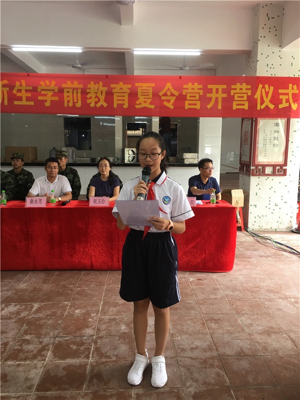 8月26日上午,全体新同学集中于西教学楼架空层举行了简短而隆重的学前教育夏令营开营仪式。启发中学谢永芳校长向新同学致欢迎辞,城区消防中队副队长曾高勇作夏令营总动员,初一2班陈咏熙同学作学生代表发言,随后各班同学都迎来了帅气的教官,学前训练正式开营。随后展开了辛苦而又富有意义的学前训练,西山寺下只见雨水与汗水。