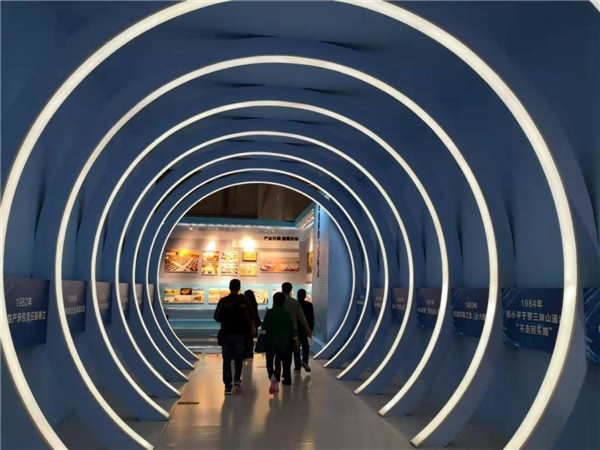 展览以时间为线索,按照中山改革开放历史发展分为五个阶段:第一部分“解放思想 探索发展(1978—1983)”、第二部分“先行先试 创新发展(1983—1992)”、第三部分“找准定位 特色发展(1992—2002)”、第四部分“转型升级 科学发展(2002—2012)”、第五部分“五位一体 全面发展(2012—至今)”。其中令人眼前一亮的是一条由诸多圆形灯带组成、名为“跨入新世纪”的蔚蓝时空隧道。灯带之间从1976年的“里溪探索推行‘联产到劳’”,到2017年的“发力粤港澳大湾区建设”,既醒目又一目了然,展现中山时代变迁。