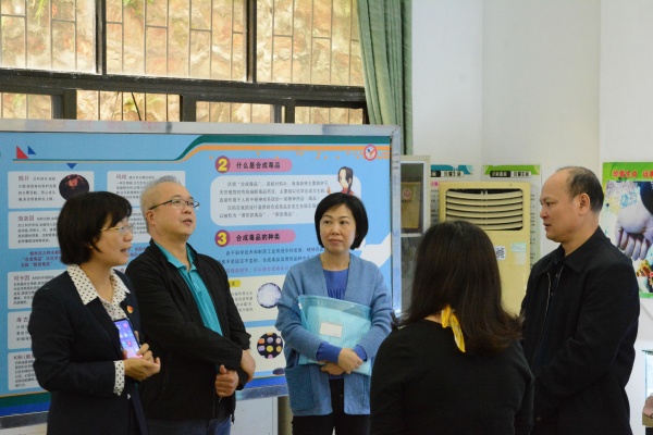 在赵翠颜校长的带领下,考察团各位领导饶有兴致地参观了禁毒基地。在毒品标本柜前,领导们驻足观看,各式各样的新型毒品模型,引起他们的深思和惊叹;在禁毒展板前,禁毒感言、禁毒LOGO设计、禁毒漫画、禁毒歌谣、禁毒誓词和禁毒微剧本等,充分调动家长和师生参与禁毒活动的积极性,开启“禁毒在体验、禁毒在参与、禁毒在创作”的教育之路;在多媒体互动区域,禁毒网络游戏闯关、吸毒后人脸变化系统吸引了不少来宾的注意,他们实地体验,认为充满趣味的互动让毒品预防教育及普及青少年法治知识变得更加容易。