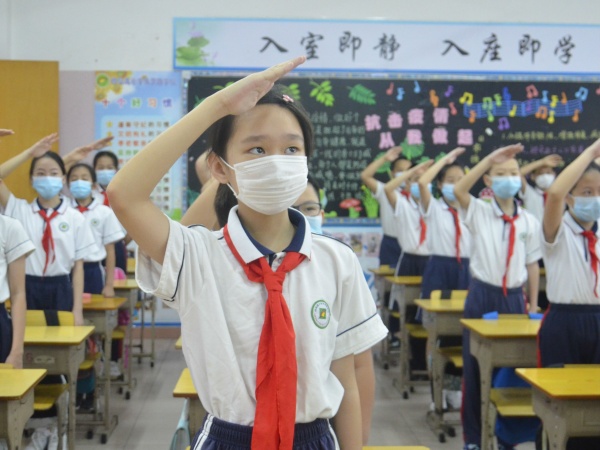 五星红旗冉冉升起,师生们高唱国歌,心情澎湃。升旗仪式上,孙华校长以《努力做更健康更好的自己》为主题作旗下讲话。她寄语同学们返校复学后要继续做好防疫工作,重视身心健康,勉励同学们继续做“专注、坚毅、自律、自强”的四好孩子,用勤奋的汗水为生命增添色彩!