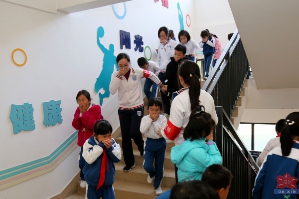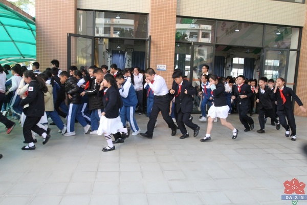 为了模拟真实的火灾场景,全校师生于下午2:45分齐聚校体育馆观看一部励志电影《奔跑的少年》。电影的内容很贴近孩子们的现实生活,孩子们也正好需要这样的励志教育,再加上故事情节曲折离奇、趣味无穷,所有的师生完全沉浸在电影中,完全和电影融为了一体。正在这个时候应急警报突然响起,全场一阵骚动,但很快就平息了下来;紧接着靠近几个出口的班级在老师的指挥下,用手掩住了口鼻,低着头,弓着腰迅速地向校操场疏散开去。离通道较远的,紧跟着人流也迅速向操场移去。全校师生两千多人,一个一个掩鼻、捂嘴警觉无比,耳边只有刺耳的警报声,前面只有快速移动的人群,没有一个人往后看,这真是一个奇迹!人群到达操场后自行分班级按照平时的集会队列整齐有序地排好。当最后一个班级到达操场时,记时员向负责演练的总负责人崔士强主任报告:总共用时4分32秒。