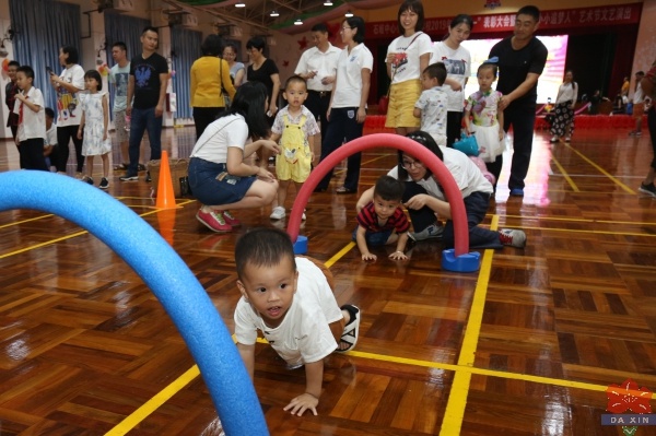 晚上7点,大家纷纷来到了庆祝活动的主会场----大信学校体育馆。迎接孩子们的是充满着节日气氛的大舞台,每年的“六?一”所有的孩子都可以在这个大舞台上一展才艺。随着主持人的报幕声响起,”现场立时成为一片欢乐的海洋!舞台上传来了小朋友的歌声、朗通声、街舞伴奏的音乐声……小小年纪的宝贝们各有绝活,让人羡慕!舞台的对面是游园活动的主阵地,六位义工老师已经准备就绪,面带微笑迎接参加游园活动的小伙伴们。“海底隧道”游戏位上,几个步履蹒跚的小家伙在家长的指引下匍匐前进,居然能顺利通关;“毽球入筐”孩子们投筐姿势各异,大一点儿的孩子毫无悬念飞投入筐,小一点儿的孩子也不甘示弱,竟然“近距离入瓮”,再小一点儿的孩子甩出的毽球与筐完全不沾边,引得在旁的家长们捧腹大笑。“足球射门”“ 足球保龄球” “羽毛球颠球”每个摊位都有一群小粉丝,他们那专注的眼神,稚拙的动作,引得在场家长们的笑声此起彼落,整个体育馆沉浸在一片欢乐祥和中。