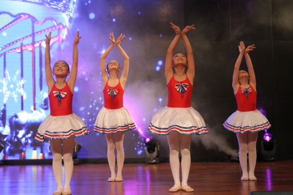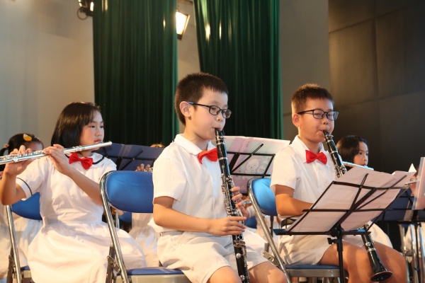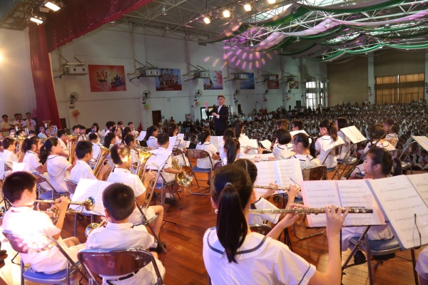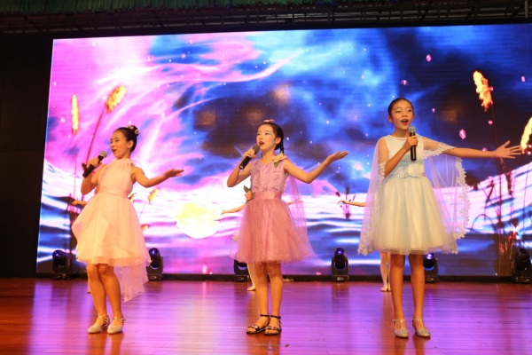 主持人在一片掌声中登上舞台,同学们期待已久的文艺演出开始了!声势浩大的管乐大合奏《Wingsongs》、《踏浪》拉开了文艺演出的序幕。在落英缤纷、如梦如幻的舞台背景下,小演奏家们在李鸿锷老师的指挥下,熟练而深情地演奏着。那欢快的乐声仿佛将观众们带到了碧海黄沙之境,让人流连忘返。