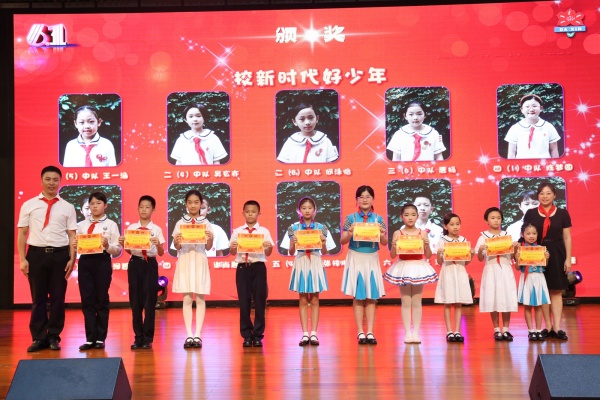 紧接着,孙慧涛主任主持了表彰大会。首先,团市委学校部部长罗必立先生向学校颁发了“全国优秀少先队集体”奖状,然后是梁校长为崔子傲(广东省优秀少先队员)、何梓瑜(广东省新时代好少年)、黄景逸(中山市最美南粤少年)、邱丹蕴(中山市新时代好少年)等四位队员颁发了相应奖状;冯冠祥副校长、蔡洁珊女士为黎桂芳等17位荣获校“优秀辅导员”称号的教师颁发了奖状,表彰她们在过去的一年中带领着各自中队脚踏实地,勇创佳绩。梁钟添副校长、杜少君副校长为六(1)中队等18个荣获校“红旗中队”称号的中队颁奖;罗必立部长、梁校长、冯校长、蔡洁珊女士为全校48个中队的优秀客座教师、好家长代表颁奖,石丽文主任、崔士强副主任、于海洋副主任、谭志凌副主任为校新时代好少年和其他奖项代表颁奖。在场的老师、同学和家长们对获奖教师和同学们报以长时间的热烈掌声,表达着祝贺,也表达着向榜样学习的决心。