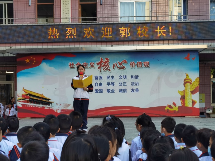 随后,郭校长进行国旗下讲话。他说带来一份礼物送给全校师生,是三颗“真、善、美”的种子。郭校长在讲话中引用大教育家陶行知的话“千教万教,教人求真,千学万学,学做真人”,并结合身边的故事生动形象的表达了自己对全校师生的要求和期盼。
