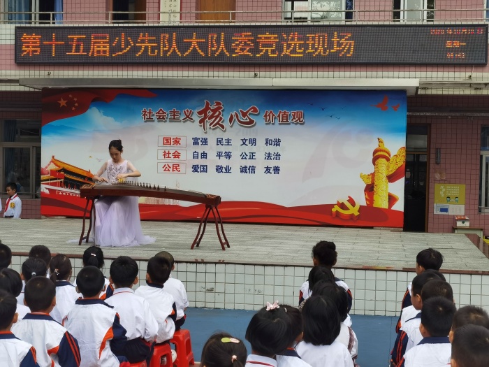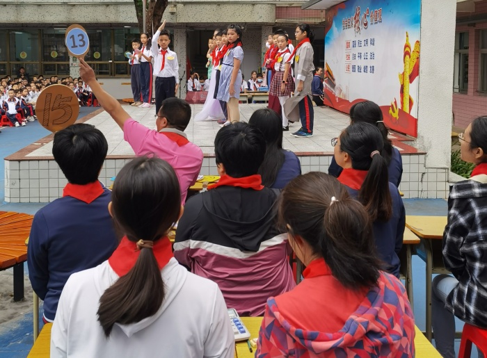 大队委竞选现场活动包括少先队技能竞赛、才艺展示和全民投票三部分。其中技能竞赛30分,才艺展示30分,全民投票30分,连同上周的竞选演讲10分共100分。由冯汉文校长带领的8位教师团队担任评委。