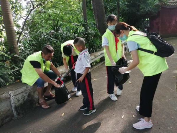 6月12日下午,六年级各班15名亲子义工家庭以及各班主任、学校行政共150多名志愿者手持清理 “神器” 来到烟墩山开展清洁工作。有的带着蓝色手套,有的拿着白色的塑料袋,还有的手拿钳子,戴手套的同学捡垃圾,拿塑料袋的家长收垃圾,就这样,大家配合的十分默契。不管年纪大小,父母和小义工们都很认真,醒目养眼的义工服成了烟墩山里一道亮丽的风景线。大路上垃圾不多,于是大家钻到花圃里发现了大量的垃圾。有游客丢弃的烟头、纸巾、果皮、瓜子、食品袋等各种生活垃圾,家长们都说没想到有这么多垃圾,袋子都快装不下了。一个多小时后,草坪上、过道上的垃圾就被检光了。大家陆陆续续回到集合点,垃圾都装满了袋子,大人和孩子们都走得满头大汗,虽然累,心里却是开心的,用行动传播环保理念,为烟墩山公园增添了亮丽的色彩,为烟墩山公园的美好环境贡献了一份力量。学校老师则以年级组为单位,利用中午的时间每周完成一次的义工服务活动,在校内、外展开清洁、消毒等工作。近日,中山天气是龙舟水加烈日高照,劳动中老师们都湿透了衣服,大家甚至顾不上喝一口水,一丝不苟地对周围环境的角角落落都进行了全方位的清理,他们忙碌拾捡的身影也吸引了一些路过的市民主动参与到捡拾行动中。