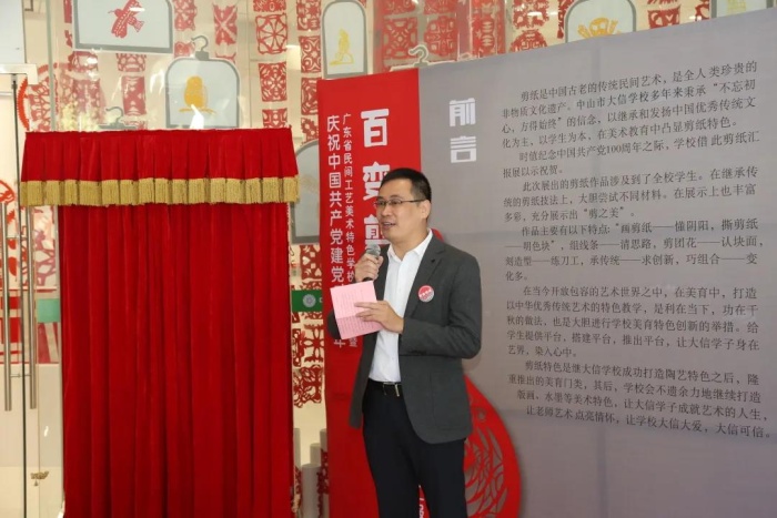 百年风雨、百年历程。2021年是中国共产党建党100周年,为了促进中山市大信学校学生的全面发展,构建高质量、高水平的素质教育实施体系,更好地实现“学校有特色,教师有专长,学生有特长”,大信学校美术教育开展了特色建设的研究与实践,培养学生发现美、表现美、创造美的美好情趣,进一步以艺术手段发展学生个性特长,提升孩子们的艺术素养,特此举办中山市大信学校“广东省民间工艺美术特色学校”揭牌仪式暨“百变剪纸”特色汇报展。