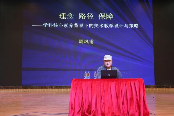 最后,就是本次活动更加精彩的环节,周凤甫老师的专题讲座《理念、路径、保障——学科核心素养背景下的美术教学设计与策略》,倡导主题性研究型美学、“大概念”——“基本问题”——“小问题”课程模式等有效建议。从理论联系实际、从实际提升理论,在周老师不断的转化之中,让听者清晰明确的了解了最新的教学思路和超前的美术教学理论,让每位老师都受益匪浅。