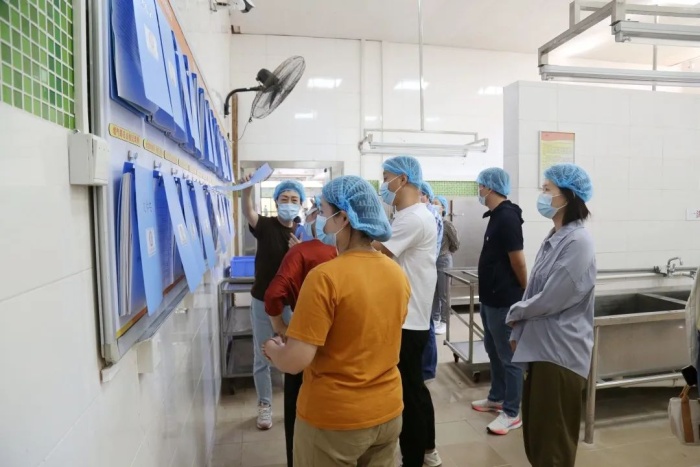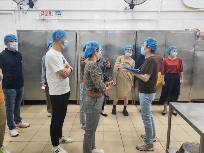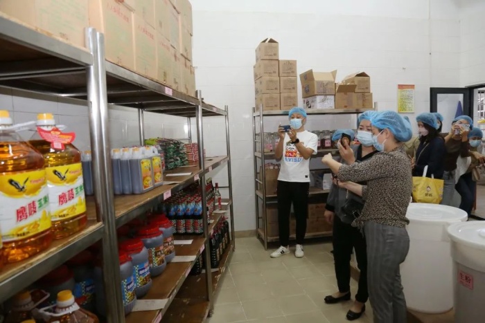 10月11日中午,初中部九年级的家长代表参与了此次家长陪餐活动,他们在学校高静副校长、食堂负责人李小玲主任的陪同下一起到食堂实地查看,对食堂的仓库、厨房、洗消间、加工区域、烹饪间、食品库等区域进行了参观,李小玲主任对餐饮原料的采购存放、加工过程管理、品质监控、餐具回收消毒等情况进行了详细的说明。