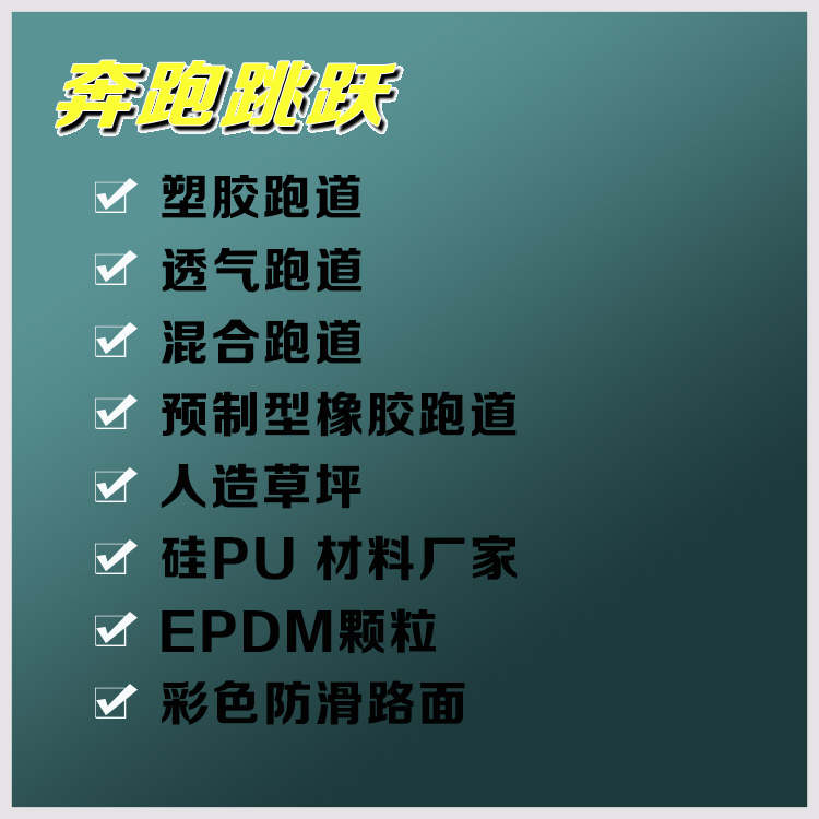 PU颗粒、颜料、助剂、填料组成。塑胶跑道具有平整度好、抗压强度高、硬度弹性适当、物理性