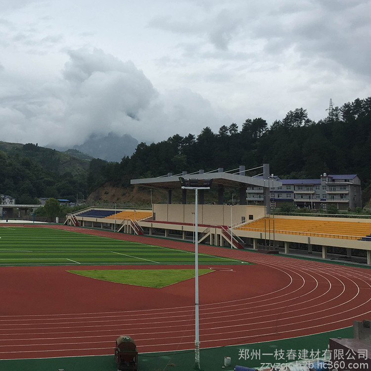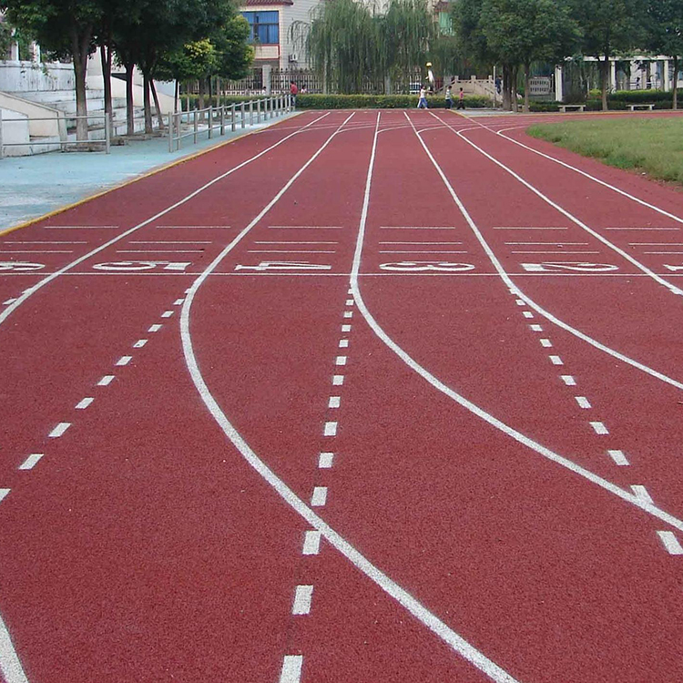 4、混合型塑胶跑道是PU与黑色橡胶颗粒按一定比例混合而成跑道系统。材料运到现场按一定比例混合,加入催化剂搅拌均匀,摊铺,常温硫化成型,该面层是现时有标准的塑胶面层材料,主要用于专业比赛用场地等。