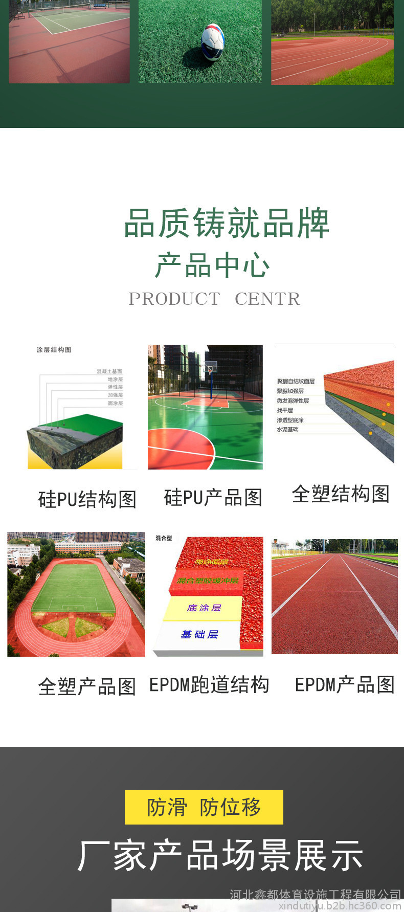 或PU颗粒、颜料、助剂、填料组成。塑胶跑道具有平整度好、抗压强度高、硬度弹性适当、物
