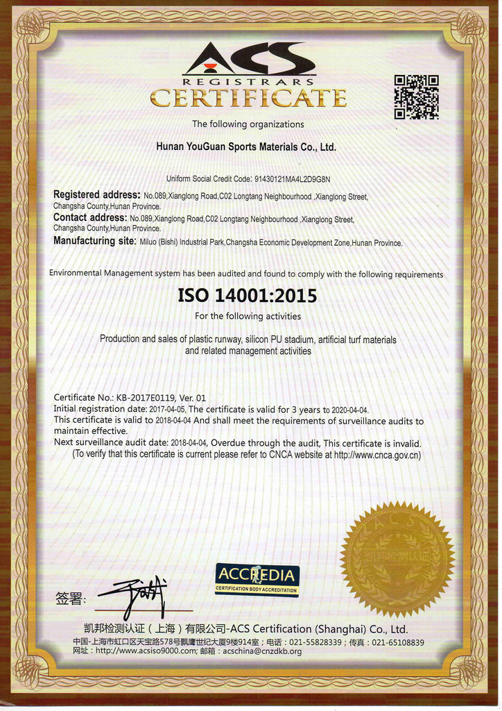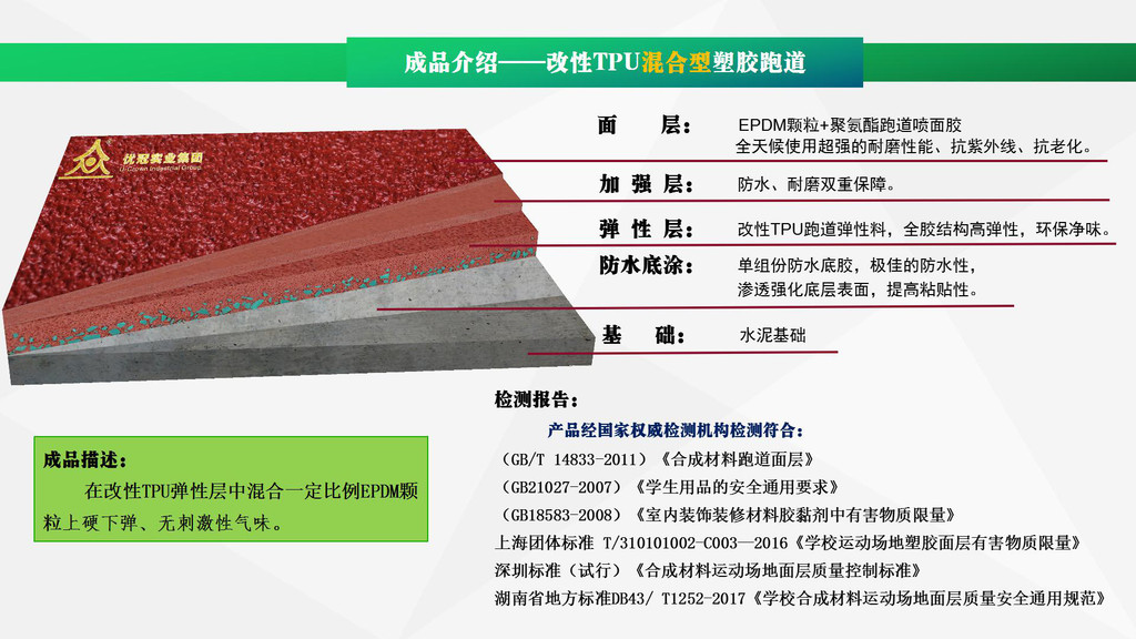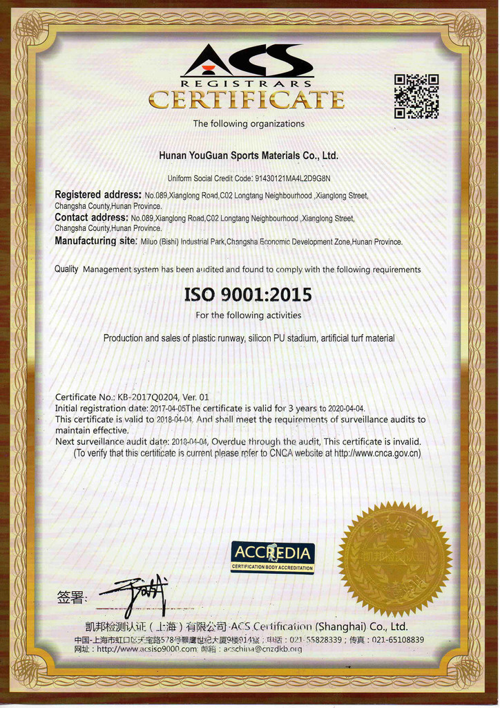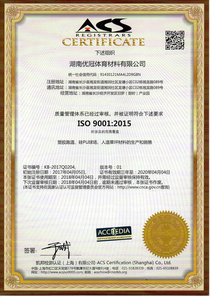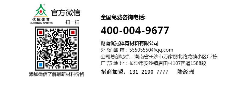 优冠实业集团有限公司(以下简称集团)是一家专业从事运动场地材料,人造草坪研发、生产、销售、铺装的科技创新型企业,是湖南省地方标准DB43/ T1252-2017《学校合成材料运动场地面层质量安全通用规范》主要起草单位之一。公司具备国际田联(IAAF)认证、国际网联(ITF)认证、中国环境标志产品认证、中国绿色材料标志授权使用证书、企业生产环评批复报告、安全生产标准化三级企业证书、对外贸易经营者备案登记表等,并成为湖南省政府采购协会会员。集团下辖湖南优冠体育材料有限公司、五舟体育设备制造有限公司、湖南康普斯人造草坪有限公司、湖南科迪环保科技有限公司、湖南优冠运动场铺装技术服务有限公司、湖南优冠塑胶体育工程有限公司。