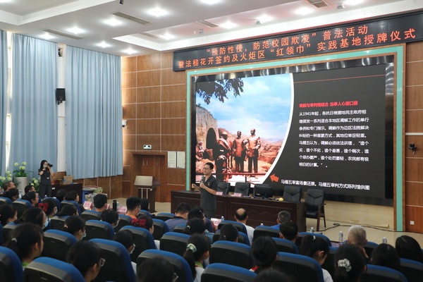 活动首先进行“法槌花开”签约及火炬区“红领巾”实践基地授牌仪式,在全体与会人员的共同见证下,中山市第一法院审判管理办公室负责人丁向娜与火炬开发区德育专干谢艺波上台现场签约,谢艺波代表火炬开发区教育事务指导中心向中山市第一人民法院授予“火炬区红领巾文明实践基地”牌匾。丁向娜表示,中山市第一人民法院开展“法槌花开”系列普法活动,旨在以法院现场研学、与法官面对面交流、法律知识问答、模拟法庭、法官体验等丰富形式,达到以真实体验润物无声的普法效果,欢迎各学校组织学生到法院开展相关活动,进一步提高学生法律和自我防范意识。