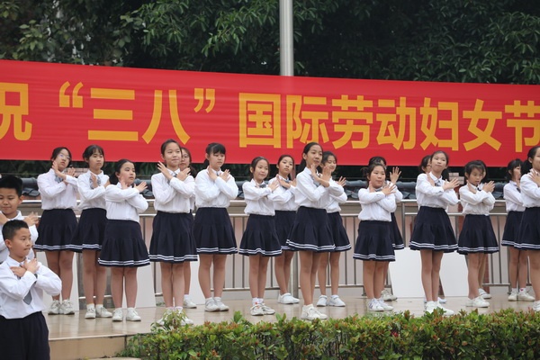 节日当天恰逢周一,升旗仪式上,学校校长陈泽湖带领全体男教师为女教师们送上了鲜艳的鲜花和真挚的节日祝福。随后,五(5)中队献上了精彩的歌舞节目《有你就幸福》,悠扬的歌声在校园中飘扬,同学们的祝福暖人心田,女教师脸上洋溢着幸福的笑容。