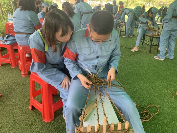 达到指定地点后,学生和家长们迅速换好军装,整理好队形,斗志昂扬地参加研学的第一项活动“重走长征路”。此项活动,由学生和家长合力组成4路纵队,“重走长征路”,体验长征途中红军运送物资的艰辛。紧接着,以家庭为单位开展“编草鞋”的有趣活动。通过两项活动,大家意识到红军在物质资源极度匮乏的情况下长征的艰辛和困苦。