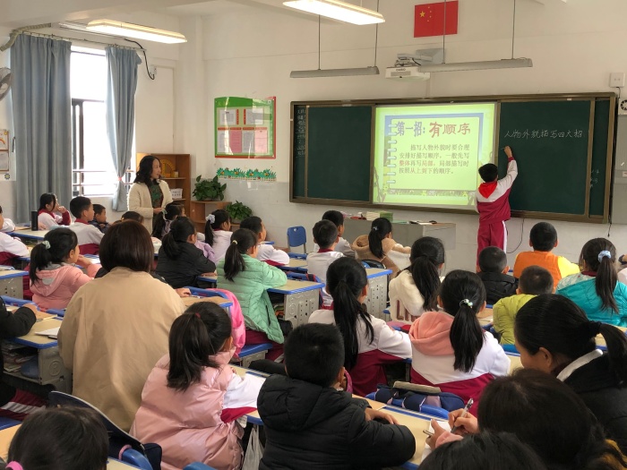 首先,胡老师在四(2)班展示了一节《人物外貌描写四大招》的习作课。课堂上,胡老师引导学生根据外貌描写的四大技巧,对现场观摩学习的老师进行外貌描述,充分调动了学生上课的热情。学生生动有趣的发言,引得现场欢笑声和掌声此起彼伏,课堂氛围轻松活跃。在欢乐的学习氛围中,四种人物外貌描写的方法在学生心中丰富形象起来,课堂上,学生的练笔层次分明、善用修辞,写出的人物形象更为鲜明。胡老师巧妙地将习作教学与学生生活相结合,为生活和习作架构了一座有效桥梁。这样充满智慧的课堂,为写作教学提供了很好的氛围。