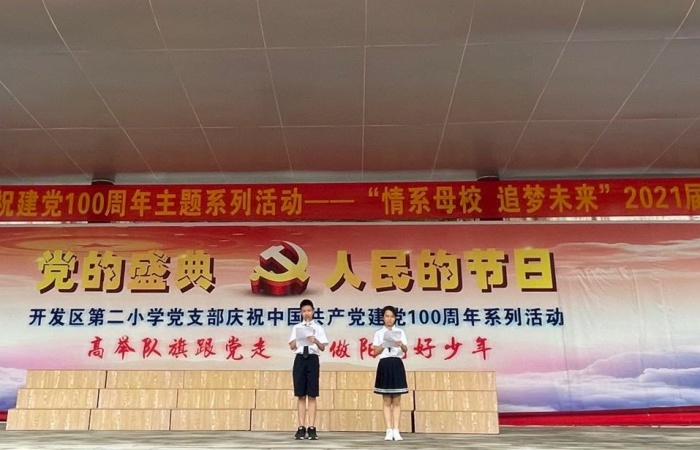 开发区第二小学2021届学生毕业典礼在学校各部门通力协作下圆满落下帷幕,毕业生们和老师们用最深情的方式向祖国百年华诞献礼。衷心祝愿开发区第二小学2021届莘莘学子树立远大志向,奋发图强,勇担社会责任,走好人生路!