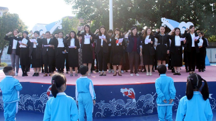 最后,胡冬梅校长还带领全体教师在庄严的国旗下进行了人民教师宣誓。