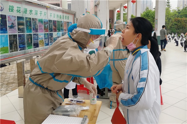 火炬区一中将自主文化广场定为检测场地,确保通风良好。受测学生从学校南门进入广场,所有学生、工作人员进校前需做体温筛查和查验粤康码,无粤康码、非绿码人员及体温异常不可入校。检测时要出示身份证或学生证(学籍号),需戴口罩。学校安排全程录像。现场共分15列纵队检测,至下午4时左右,市疾控中心的工作人员完成全部检测任务。