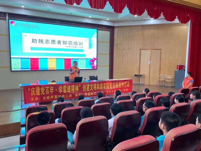 同时,为了更好地了解与帮助残疾人士,火炬二中特邀同益社会工作服务中心的工作人员来到火炬二中进行“助残志愿者知识培训”,通过专题讲座的形式,让广大师生能够在生活中更加科学合理地帮助残疾人士。