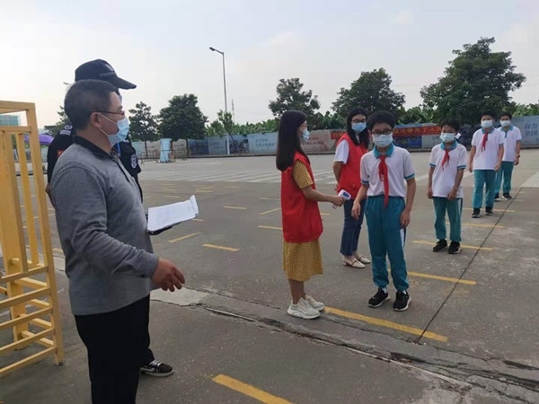演练内容为学生在校门口测温发现异常及应急处置。在演练中,学生间隔一米排队入园。进班前由班主任对所在班级学生进行晨午检,并做好晨午检记录,病因追踪报告及复课证明查验等日常工作。在通过学校门口测温时,测温教师发现其中一名学生体温异常,该教师立刻把该学生带到临时观察点并让校医再次对该学生进行测温。校医水银体温计核实体温,询问并登记该生在14天内有无疫情重点地区旅游史、途径史,有无确诊、疑似病例接触史。嘱咐家长到医院就医。随后,学生被家长接回,后勤人员到观察室进行消毒。通过各个小组的相互配合,演练有序进行,行动迅速,有效强化了师生安全意识和应急避险及疏散能力。