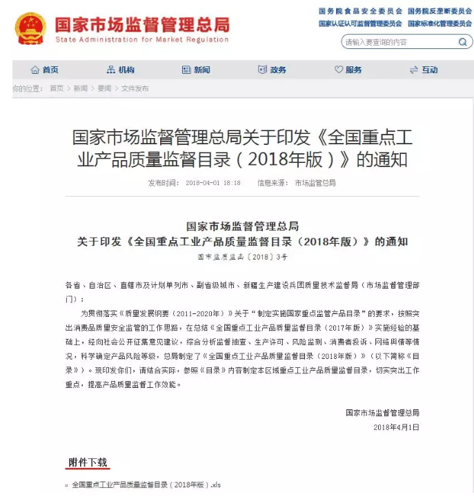 4月1日,国家市场监督管理总局印发了关于《全国重点工业产品质量监督目录(2018年版)》的通知: