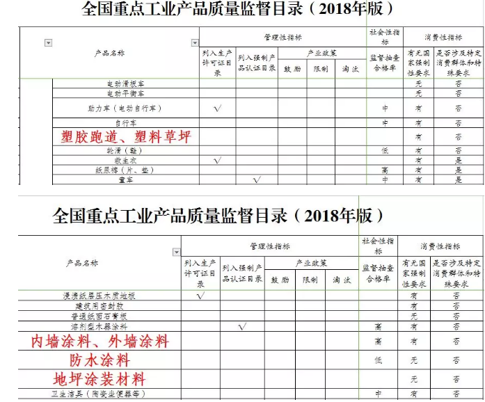 其中,塑胶跑道、人造草坪、内墙涂料、外墙涂料、防水涂料、地坪涂装材料等被列入《监督目录》,有国家强制性要求(消费性指标)。