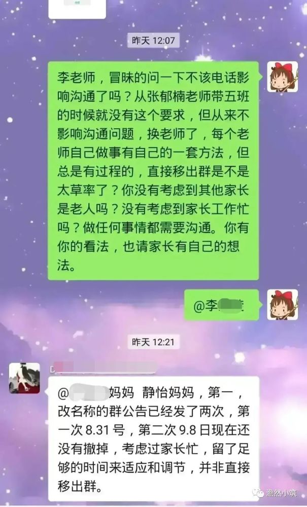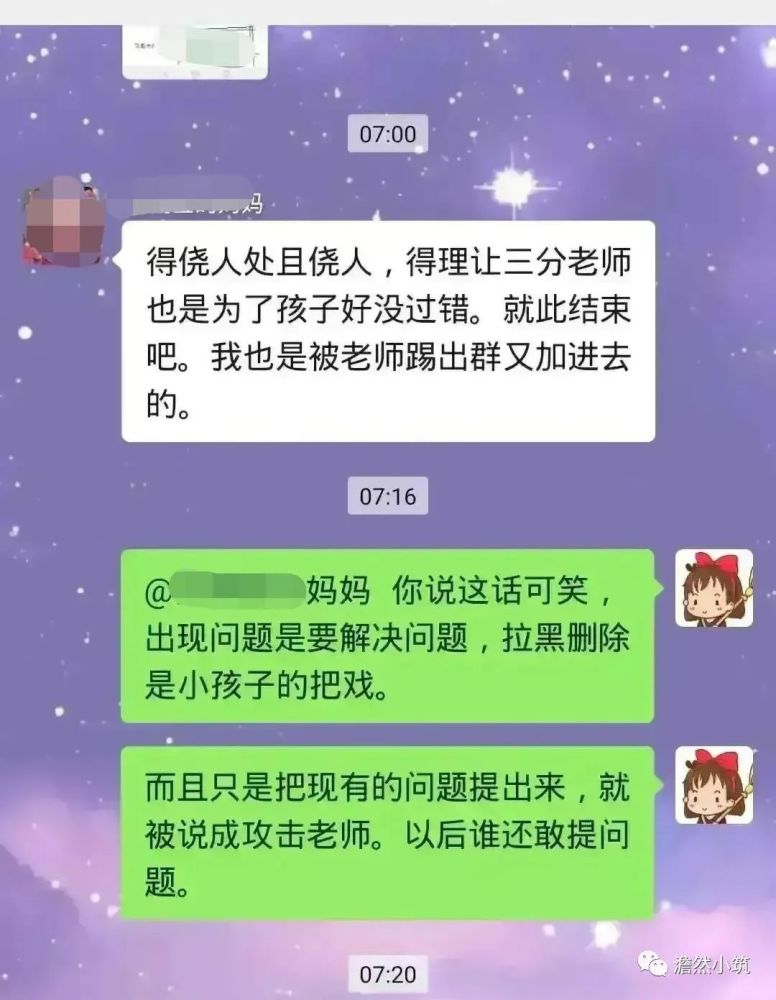 于是这位家长表示之前孩子们的老师没这么多事儿,直接把人移出去难道没考虑到群里有老人的情况吗?没考虑到家长忙的情况吗?并向老师表示:“你有你的看法,也请家长有自己的想法。”