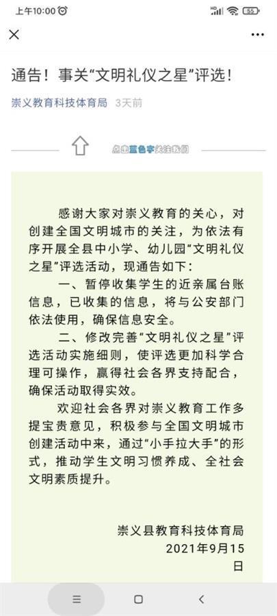 就在同一日,崇义县教育科技体育局微信公众号又发布了一条通告。通告称,暂停收集学生的近亲属台账信息,已收集的信息,将与公安部门依法使用,确保信息安全;修改完善“文明礼仪之星”评选活动实施细则,使评选更加科学合理可操作。