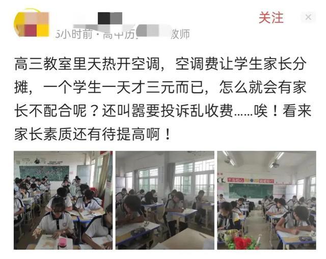 近日,某学校的老师在网上发布了一则动态,内容大致是:高三的教室因天热要开空调,空调费要让学生分摊,每人每天三元,家长对于这样的收费标准,产生了质疑,而那名老师更是直言家长的素质差!
