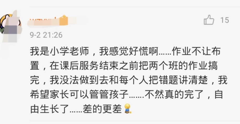 一个老师的话代表了一部分老师的心声,就是希望家长不要太放松孩子的学习。老师的意思应该是,有的孩子入门比较慢,有的孩子起步比其他孩子晚,这并不代表这些孩子就真的比别人差,而老师在课堂上讲的东西有限,现在又不能布置家庭作业给孩子们巩固知识,如果家长能管管孩子的学习,说不定有的孩子能跟上来,不然,差的更差,好的也会掉队。