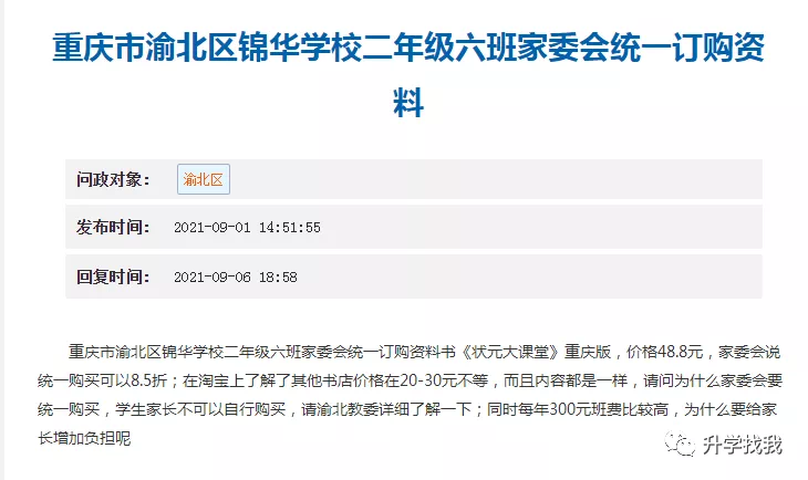 9月1日,有网友在重庆网络问政平台举报,家委会统一订购资料《状元大课堂》, 还提到每学期300元的班费,收费太高。