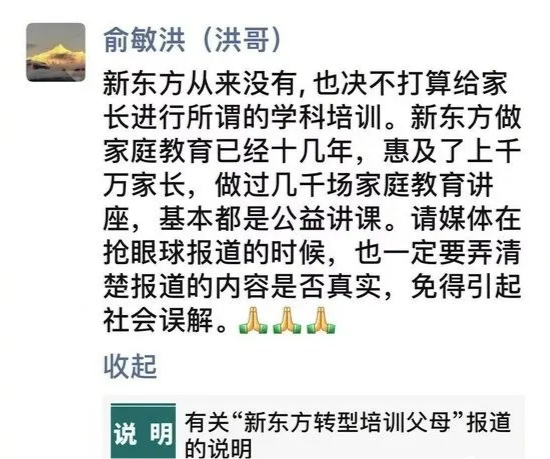 其实大家完全没必要这么慌,这不国家还没说啥,俞敏洪就扛不住了,赶紧出来澄清:“目前做的只是针对家长的公益讲座,新东方从来没有,也绝不打算给家长进行培训。”