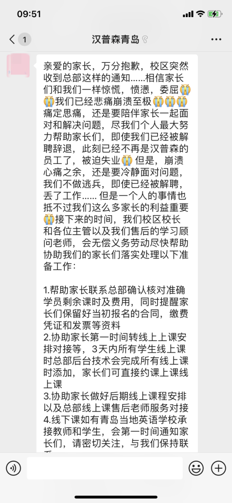 随后,赵女士给记者发来了学校给家长发布的公开信。学校发布声明说,不得不非常遗憾的跟家长说一声再见。虽然学校一直在坚持,但是在9月截止到目前依旧零收入的现实面前,学校不得不让步。