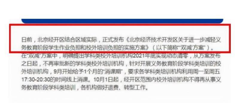 北京经开区发出了双减的进一步方案,对于原来周中可以开班的学科类培训课程,将于2021年底实行动态清零,9月份是一个缓冲期,从十一假期开始,该地区的所有校外培训班的学科类课程面临关停,周中上课已然成了过去式,对于已经付费的家长,各机构也将于2周一到周五实行退费和消课。