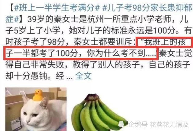 一位杭州39岁的妈妈是一所重点小学的老师,儿子五岁上小学,他对儿子的标准永远是100分,有时孩子考了98分,秦女士就会训斥,我班上的孩子一半都考了100分,你为什么考不到?她觉得自己很失败,患有严重的抑郁症。