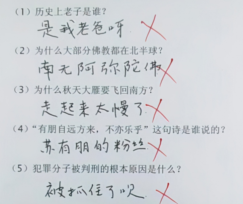 在考试中遇到不会做的题目并不奇怪,多数学生会抱着侥幸心理去“凑字数”,心想:就算是答不对,老师应该也会看在我写了这么多字的份上多给两分吧。但有些学生却剑走偏锋。
