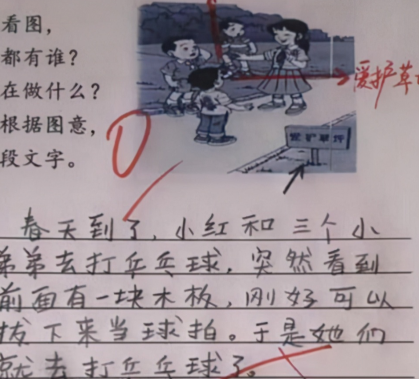 请看这位小学生的试卷,题目的意思是要教育小学生爱护草坪,还特意在很醒目的位置放置了一个“爱护草坪”的牌子。不过这位小学生却将它当成了乒乓球拍用,难怪老师会给零分。