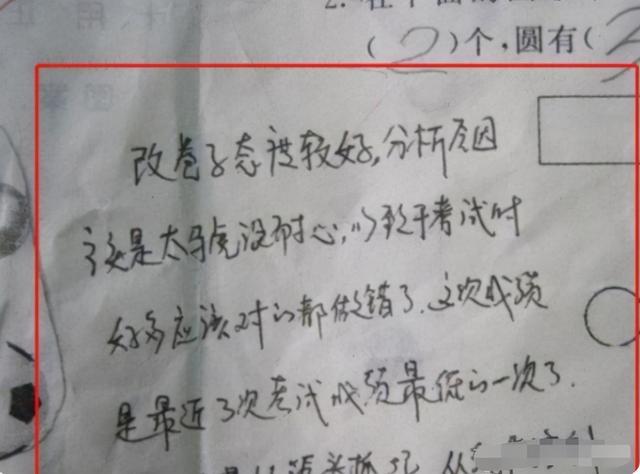 就拿这位家长来说,他在试卷上写下了学生改卷子时的态度,还分析总结错题原因,最后还写了一段对学生鼓励的话,这些都能表明他确实认真看了孩子的试卷。