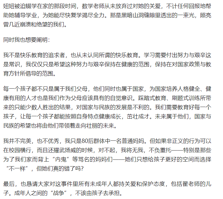 斥责班主任翟老师跟“双减”政策作对的,骂学校的,骂37位家长自私自利的……被要求转学的7岁孩子受伤了,她的妈妈,俨然是斗士,乃至于是中国教育的殉道者!