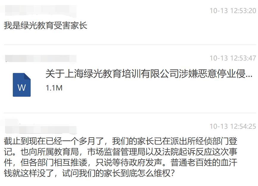 星空体育是上海绿光教育培训有限公司石泉店(以下简称“绿光教育”)正在就读或准备开始学习的学生家长,星空体育因绿光教育突然停业受到不同程度的财产损失,多则数万,少则数千。绿光教育门店遍布上海,其他校区数千名绿光教育学员家长与星空体育相同遭遇,全市受害家长人数之多,财产损失之大,实在令人无法接受。绿光教育石泉路校区部分受害家长自发组成微信群,以接龙方式统计损失,截止目前登记的受害家庭284户,涉及损失金额达366万元。其中仅2021年7月或8月期间报名的受害家庭就达30户,涉及损失金额37.73万元,该部分家长报名至今一节课未上。为维护国家政策的严肃性及众多家长的合法权益,现将有关情况汇报如下: