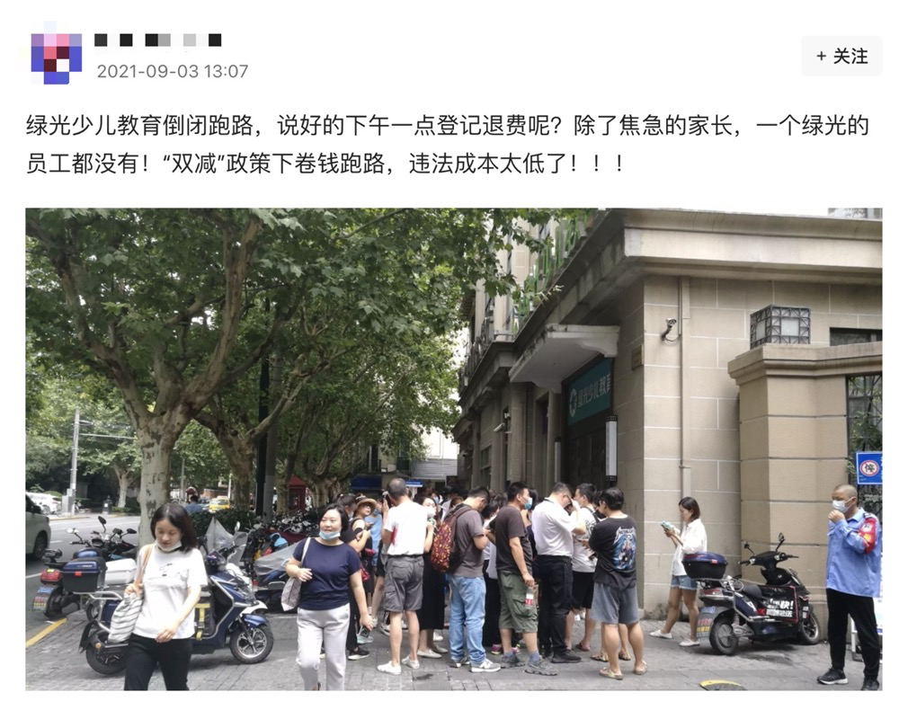 2021年9月3日,在上海经营了20年之久的学科类教培机构――“绿光教育”毫无征兆地在其官方微信公众号发布了其破产关校的公告。