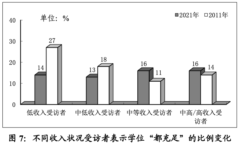值得关注的是,较2011年,低收入和中低收入受访者表示学位“都充足”的比例下降,其中低收入受访者表示“都充足”的比例明显下降了13个百分点为14%,中低收入受访者表示“都充足”的比例下降了5个百分点为13%,与其他收入人群比例持平或上升有着明显差异。