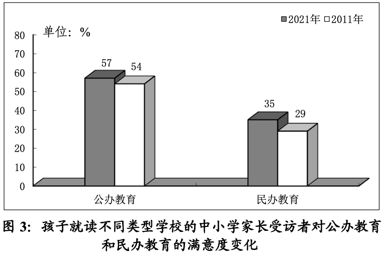 在学位供给方面,表示各阶段教育的学位“都充足”的受访者比例仅有17%。进一步关注家长受访者的评价发现,在表示学位不足的家长受访者中,最多人认为幼儿园学位不足,比例为44%;认为小学学位不足的家长有41%;认为初中、高中学位不足的家长亦均超过三成。与2011年相关调查相比,家长受访者对各阶段教育学位供给的评价没有太大改善。
