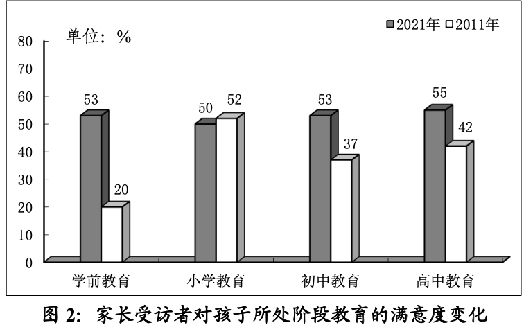 从不同阶段的教育服务来看,孩子在读幼儿园、小学、初中、高中的家长对孩子所处阶段教育的满意度在50%及以上。较2011年,这些人群对学前教育、初中教育和高中教育的评价改善,满意度分别上升了33个百分点、16个百分点和13个百分点。但小学教育的满意度多年维持在50%左右的水平,值得注意。