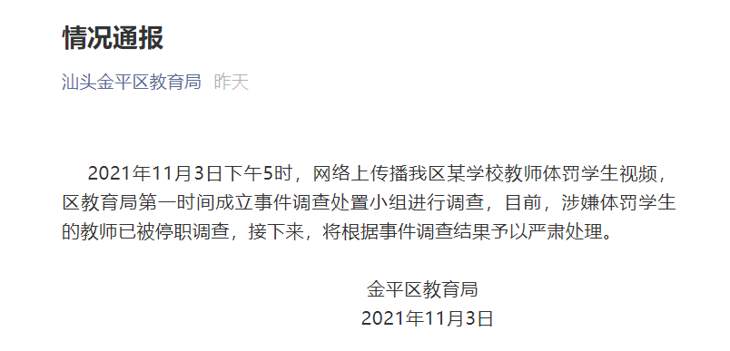 11月3日,汕头金平区教育局官方账号针对该视频发布情况通报。通报中称,区教育局第一时间成立事件调查处理小组进行调查,目前涉嫌体罚学生的教师已被停职调查,接下来将根据事件调查结果予以严肃处理。